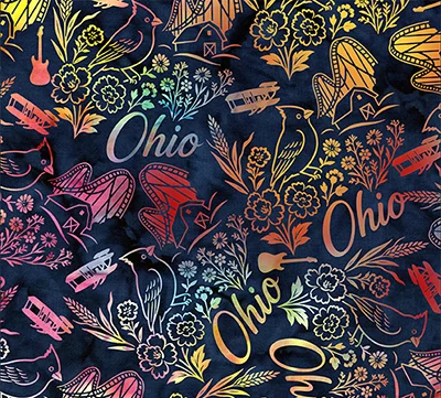 This year’s fabrics are colorful batik prints. There are eight unique designs with color variations for 17 total fabrics. All have imagery related to Ohio – buckeyes, cardinals, flags, flowers, vines and two word toss designs. Ten fun blender fabrics are available to round out the collection.