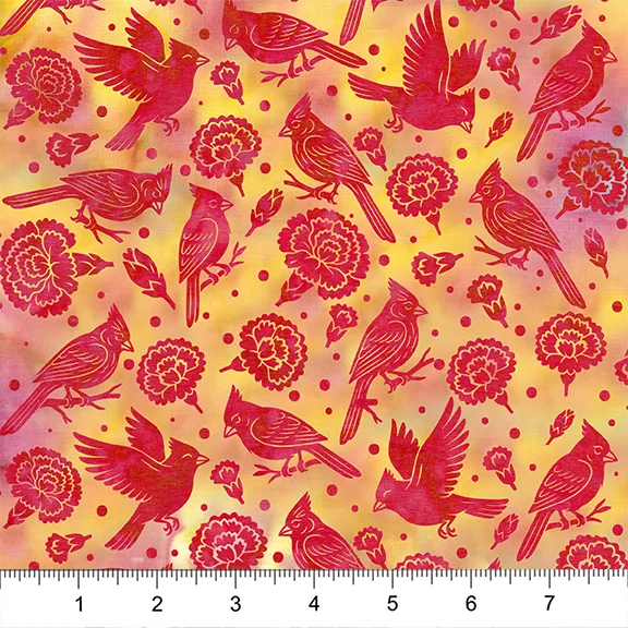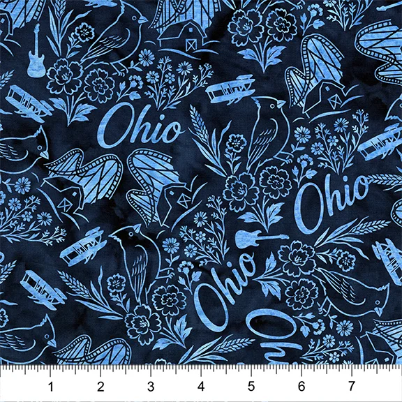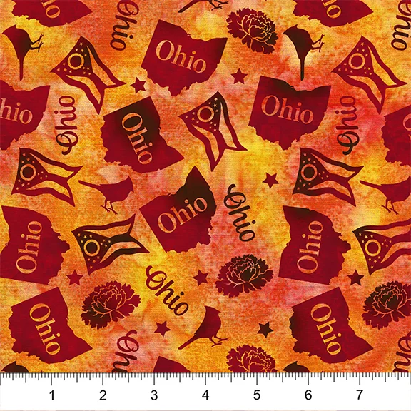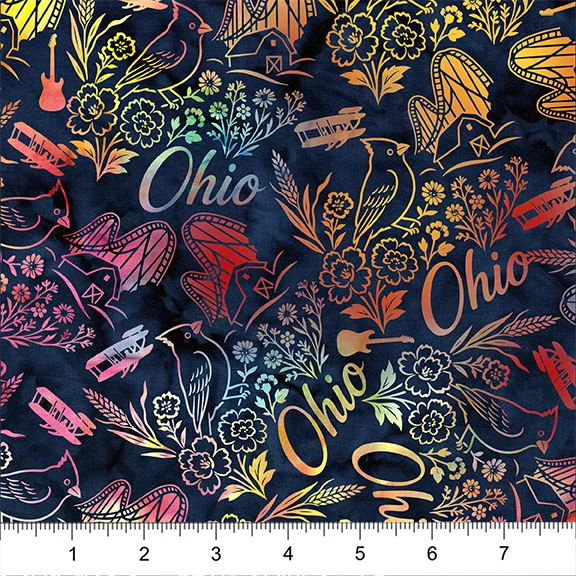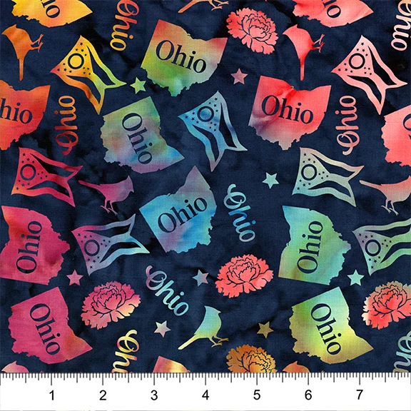 This year’s fabrics are colorful batik prints. There are eight unique designs with color variations for 17 total fabrics. All have imagery related to Ohio – buckeyes, cardinals, flags, flowers, vines and two word toss designs. Ten fun blender fabrics are available to round out the collection.